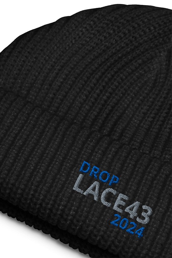 Gorro Drop Signature 2024: Diseño minimalista en color negro, con bordado exclusivo DROP 2024 en el frente y LACE43 en el lateral. Basado en el modelo AS Colour 1120, combina estilo, comodidad y durabilidad. ✨🖤