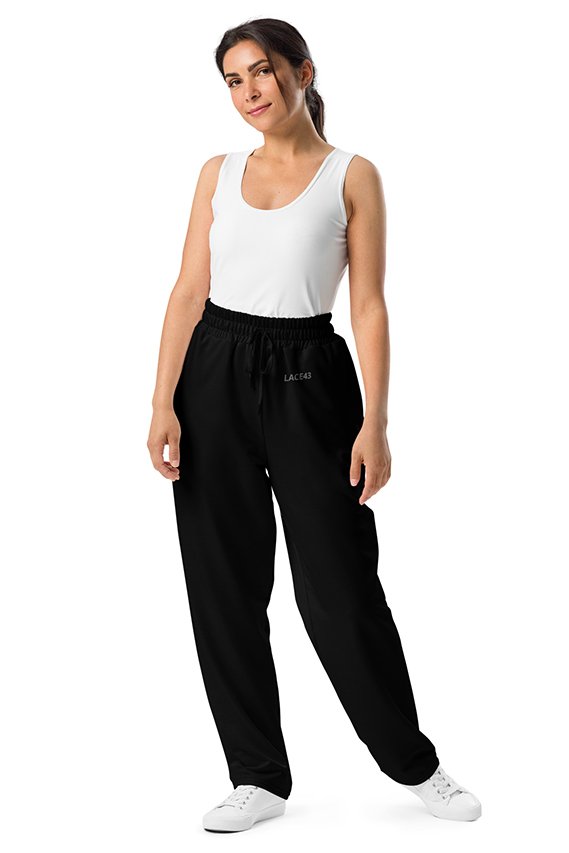 Pantalón de chándal unisex en color negro con corte de pierna ancha. Con la marca LACE43 en la parte frontal en grande, este jogger ofrece comodidad y estilo audaz para el día a día.