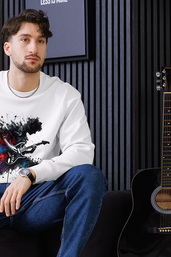- Impresión artística en la parte frontal, que muestra a un rockero en una fusión dinámica de colores y formas diluidas. Este diseño transmite energía, pasión y estilo moderno.